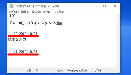 これでメモ帳を開くたびに、自動入力された日時が追加されていきます。