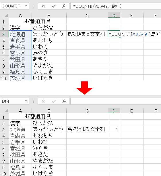 島から始まる都道府県 例 島* ![]() 県で終わる都道府県 例 *県 ![]() 田を含む都道府県 例 *田* ![]() 2文字の文字列で1文字目が山の都道府県 例 山? ![]() 2文字の文字列で2文字目が川の都道府県 例 ?川 ![]() 3文字の文字列で2文字目が海の都道府県 例 ?海?