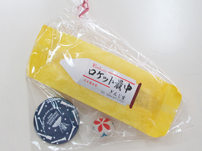 お土産にロケット最中、ロケットがデザインされた缶バッヂ、貝のストラップをもらいました。